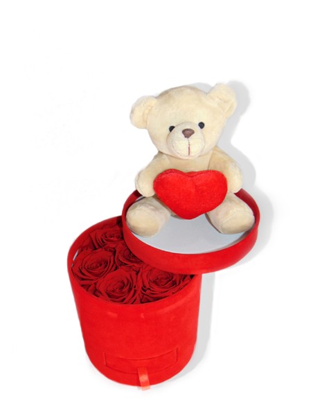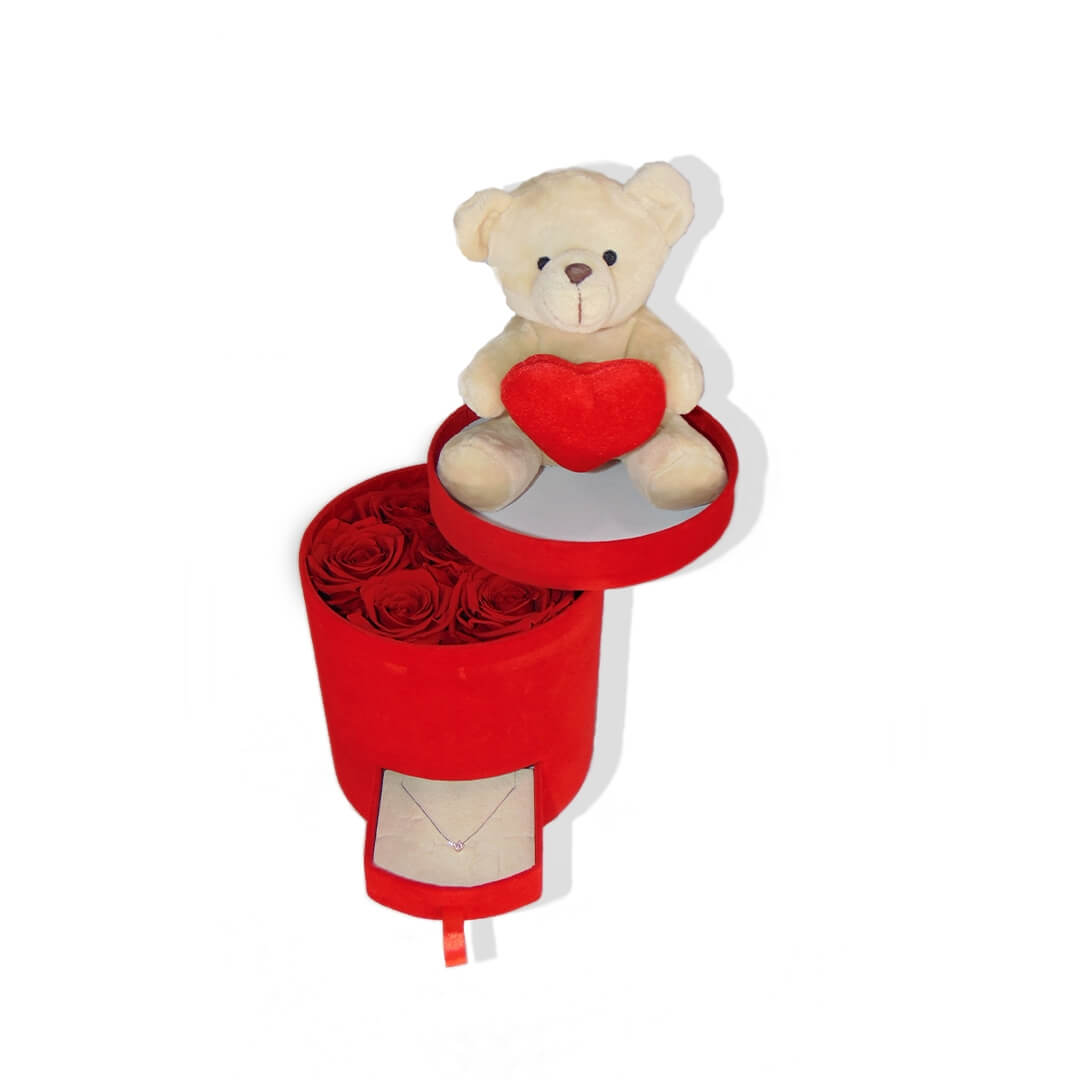 Cappelliera in velluto“Per sempre” con rose rosse, cassettino porta-gioiello punto luce in argento 925 in collaborazione con gioielleria fabiani e tenero orsetto dai colori misti, bianco, beije o cioccolato con cuore: un’unica creazione che unisce fiori, peluche e sorpresa, perfetta per un San Valentino indimenticabile!