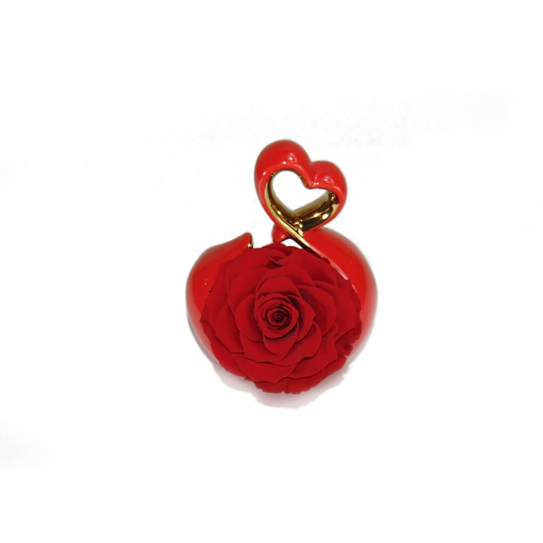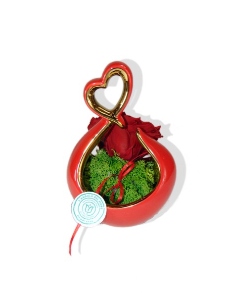 Rosa stabilizzata “Promessa” in elegante cuore di ceramica rossa con dettaglio dorato: un simbolo romantico e raffinato, perfetto per dichiarazioni d’amore e promesse che durano nel tempo.