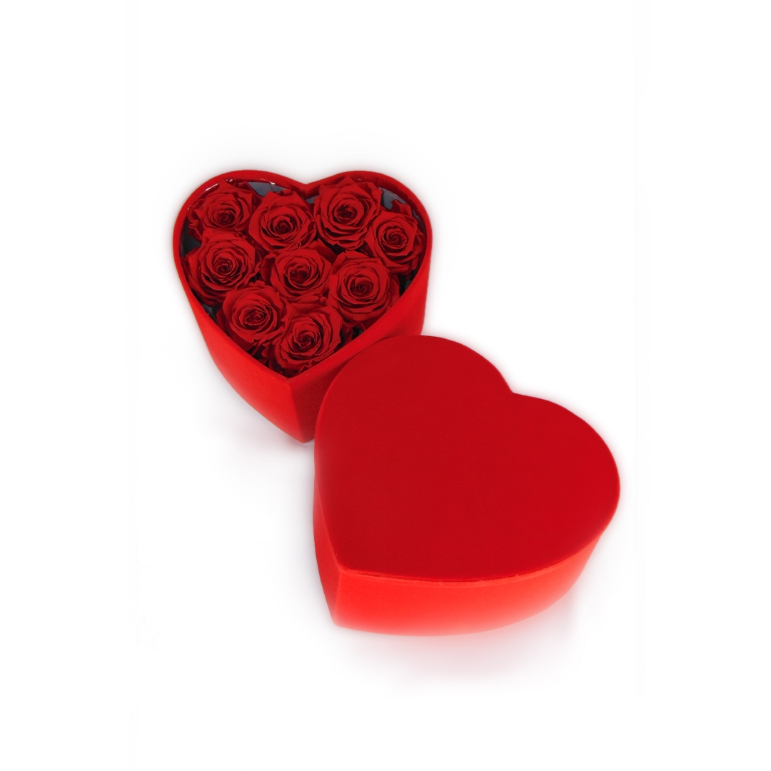 “Velluto Rosso”: scatola a cuore rossa con 9 rose rosso scarlatto, un’esplosione di passione eterna, regalo raffinato e sensuale per San Valentino o dichiarazioni d’amore intense.