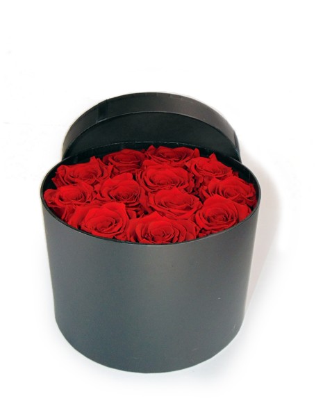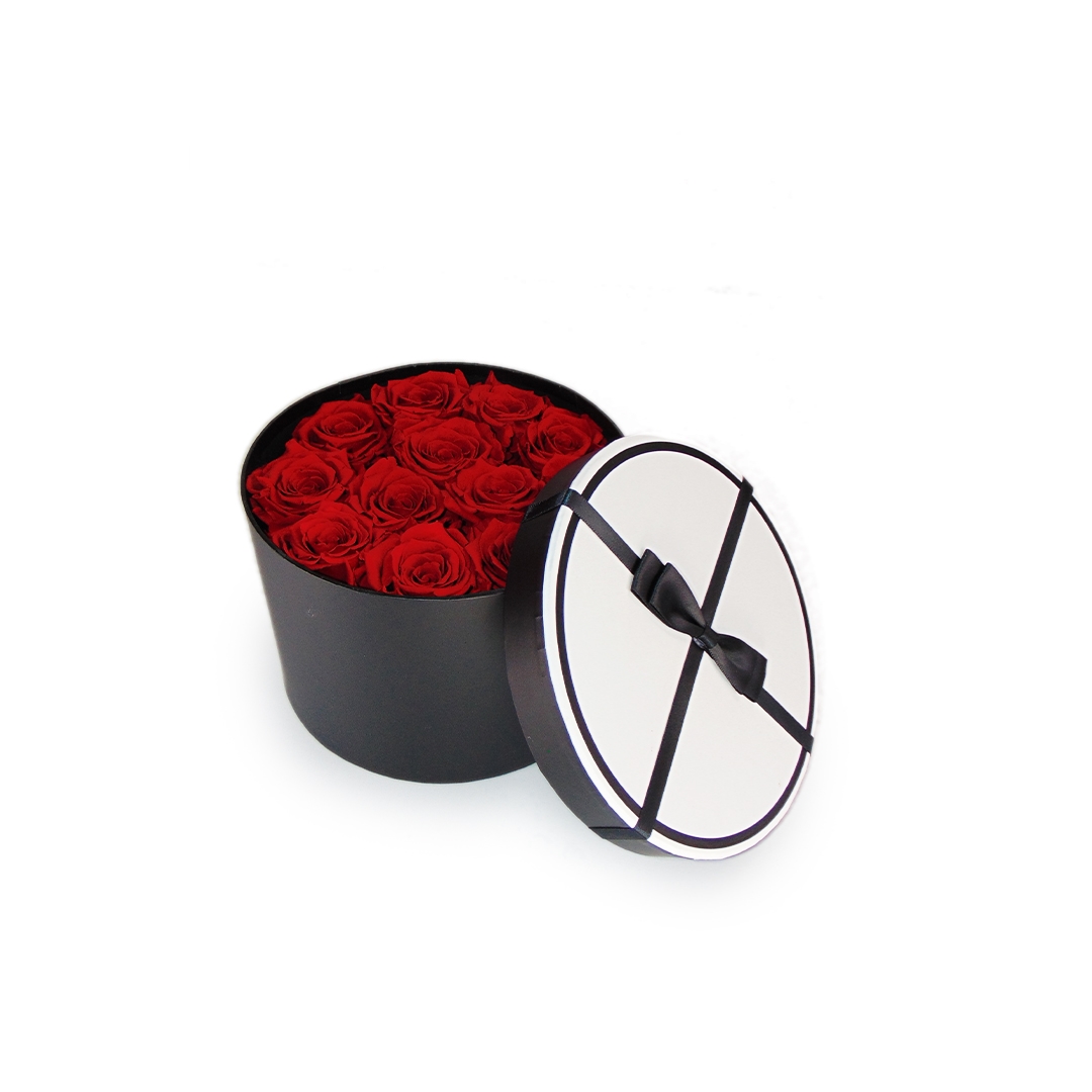 “Velvet Roses”: scatola cilindrica nera con rose rosso scarlatto e coperchio bianco elegante, un regalo di passione sofisticata e duratura, ideale per San Valentino